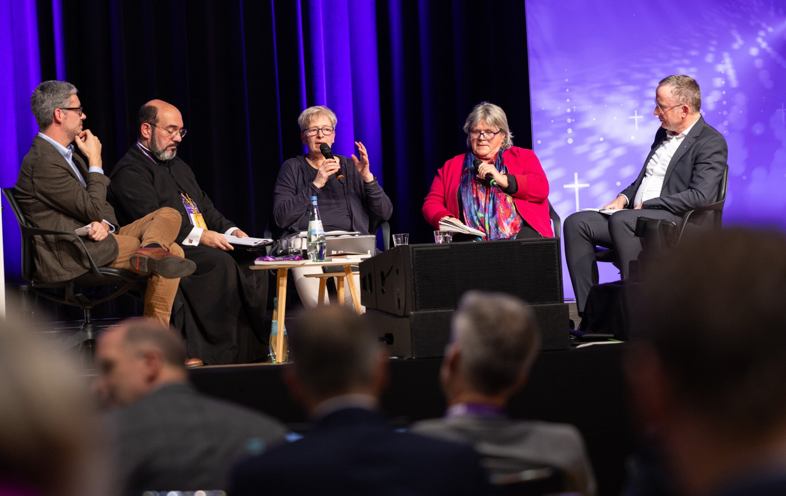Bischof Emmanuel von Christoupolis (Griechisch-Orthodoxe Metropolie von Deutschland), Oberkirchenrätin Dr. Maria Stettner (Ökumene-Referentin der VELKD), Pastorin i.R. Doris Hege (Vorsitzende der Arbeitsgemeinschaft Mennonitischer Gemeinden in Deutschland) und Landesbischof Christian Kopp (Catholica-Beauftragter der VELKD und Ökumene-Beauftragter der EKD) diskutierten gemeinsam mit Prof. Dr. Christian Stoll das Thema „Macht in der Kirche“ auf einem Podium, dass im Rahmen der gemeinsamen Synode der Evangelischen Kirche in Deutschland (EKD) und der Vereinigten Evangelisch-Lutherischen Kirche Deutschlands (VELKD) in Dresden stattfand. Bei der anschließenden Diskussion mit dem synodalen Plenum wurde Christian Stoll um Erläuterungen der derzeitigen synodalen Prozesse in der katholischen Kirche gebeten. Er plädierte dafür, bei der synodalen Neuausrichtung der katholischen Kirche von den ökumenischen Partnern zu lernen und ihre Erfahrungen mit praktizierter Synodalität besser kennenzulernen.