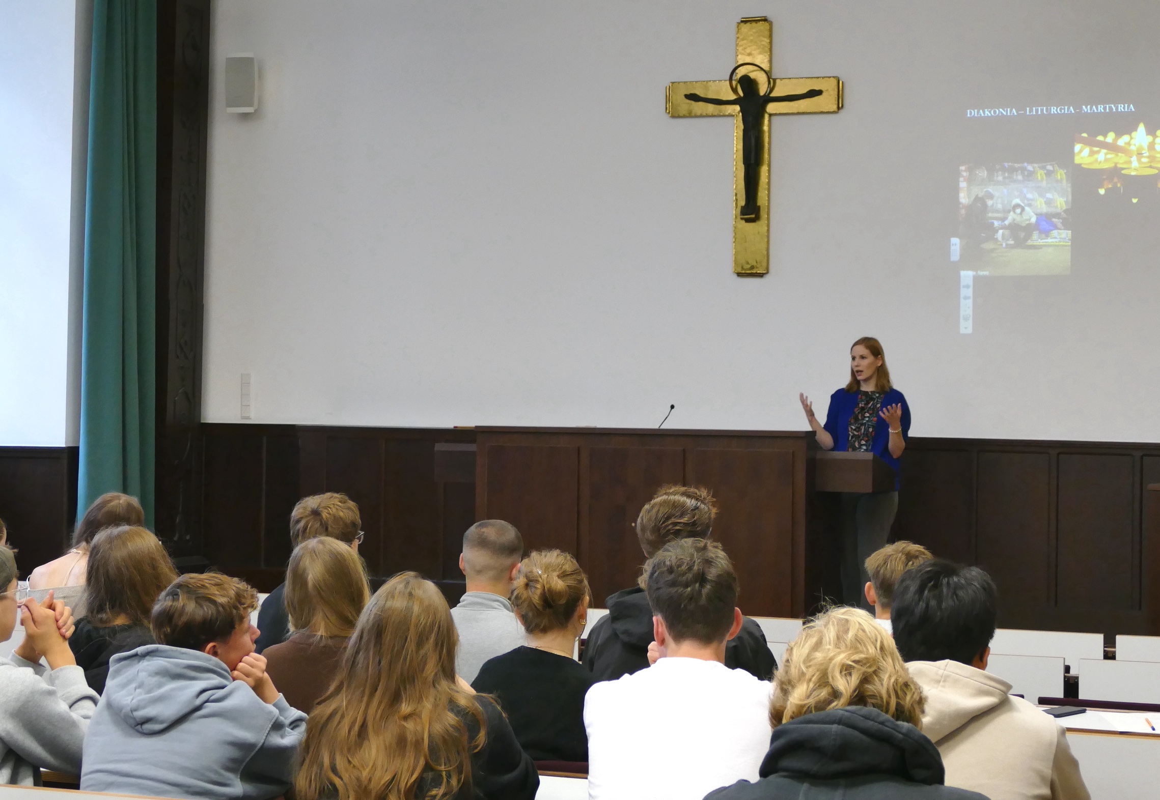 In der Vorlesung von Juniorprofessorin Cornelia Dockter, Lehrstuhlinhaberin für Ökumenische Theologie, zu dem Thema „Warum Kirche? Wege aus der Dauerkrise der katholischen Kirche“ beschäftigten sich die Schülerinnen und Schüler zunächst mit der Frage, ob die Kirche Bedeutung für ihr Leben hat. Nach der Betrachtung der Situation der Religiosität in Deutschland wurden Gründe für eine geringe Bindung der Menschen an die Kirche und Gründe für die Neigung zum Kirchenaustritt diskutiert, bevor abschließend die gesellschaftliche Bedeutung der Kirche und ihre Verantwortung für den gesellschaftlichen Zusammenhalt herausgestellt wurde. Besonders die kirchlichen Grundvollzüge Diakonie, Liturgie und Verkündigung, sowie die Bedeutung der Rituale in unserer Gesellschaft waren dabei Gegenstand der Diskussion.