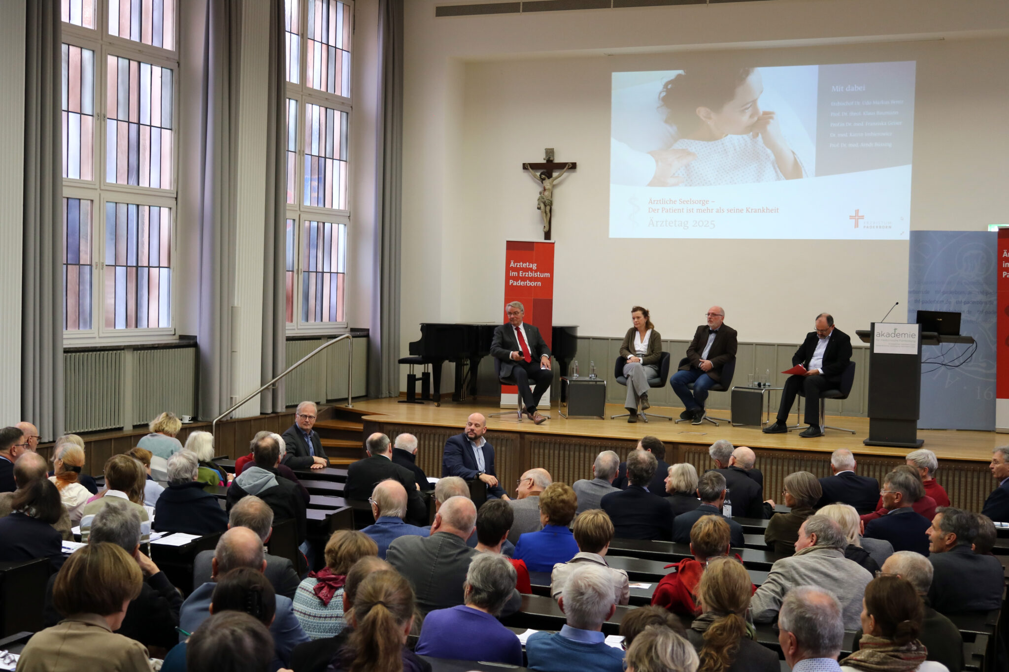 Einmal jährlich lädt das Erzbistum Paderborn zum Ärztetag. Dieses Austauschforum für Angehörige der Heilberufe hat sich bestens entwickelt. Und so musste Dr. Werner Sosna als Koordinator der Veranstaltung in diesem Jahr eine entsprechende Räumlichkeit für rund 180 Gäste finden. „Für das Audimax der Theologischen Fakultät ist es eine Premiere, für mich ein Abschied“, begrüßte Sosna die Gäste – er befindet sich bereits im beruflichen Ruhestand und hat den Ärztetag jetzt letztmalig federführend als Kopf einer Projektgruppe organisiert.