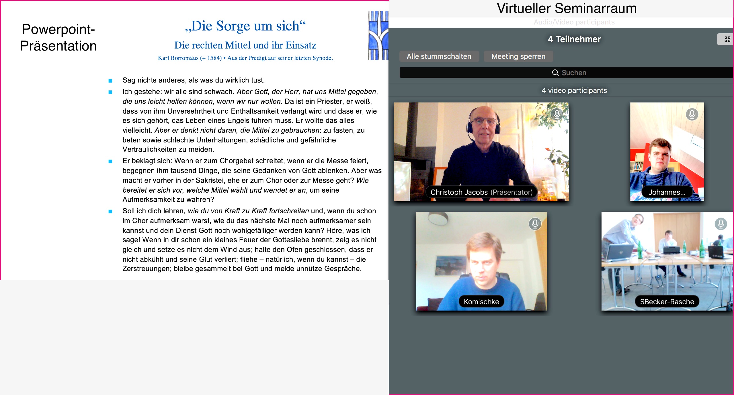 Unter dem Seminartitel „Lebenskultur in der Seelsorge“ hielt Professor Jacobs eine Vorlesung mit Übungen, also eine klassische akademische Lehrveranstaltung. Die genutzte Konferenzsoftware ermöglicht eine Zwei-Wege-Kommunikation in Echtzeit. Die Teilnehmenden sehen auf ihrem Bildschirm sowohl alle Teilnehmenden als auch die Unterlagen, die für die jeweilige Seminarphase relevant sind. „Ich habe meine Vorlesung mit vorbereiteten Folien gehalten, wir haben miteinander diskutiert und gearbeitet“, beschreibt Prof. Jacobs. Es gab aber auch Phasen der Einzel- und Gruppenarbeit, nach denen sich alle wieder im virtuellen Konferenzraum einfanden und die Ergebnisse teilten und diskutierten. Unterlagen wurden per Mail versandt. „Kombiniert man diese Form der virtuellen Präsenzveranstaltung mit einer Lernplattform, die das Teilen von Dokumenten und das selbstständige Erarbeiten von Wissen, Texten anhand angeleiteter Aufgaben und Materialien ermöglicht, mit denen man dann im Seminar gemeinsam wieder weiterarbeiten kann, so lassen sich damit sehr effektiv und komfortabel Lehrveranstaltungen realisieren“, ist sich Professor Jacobs sicher.
