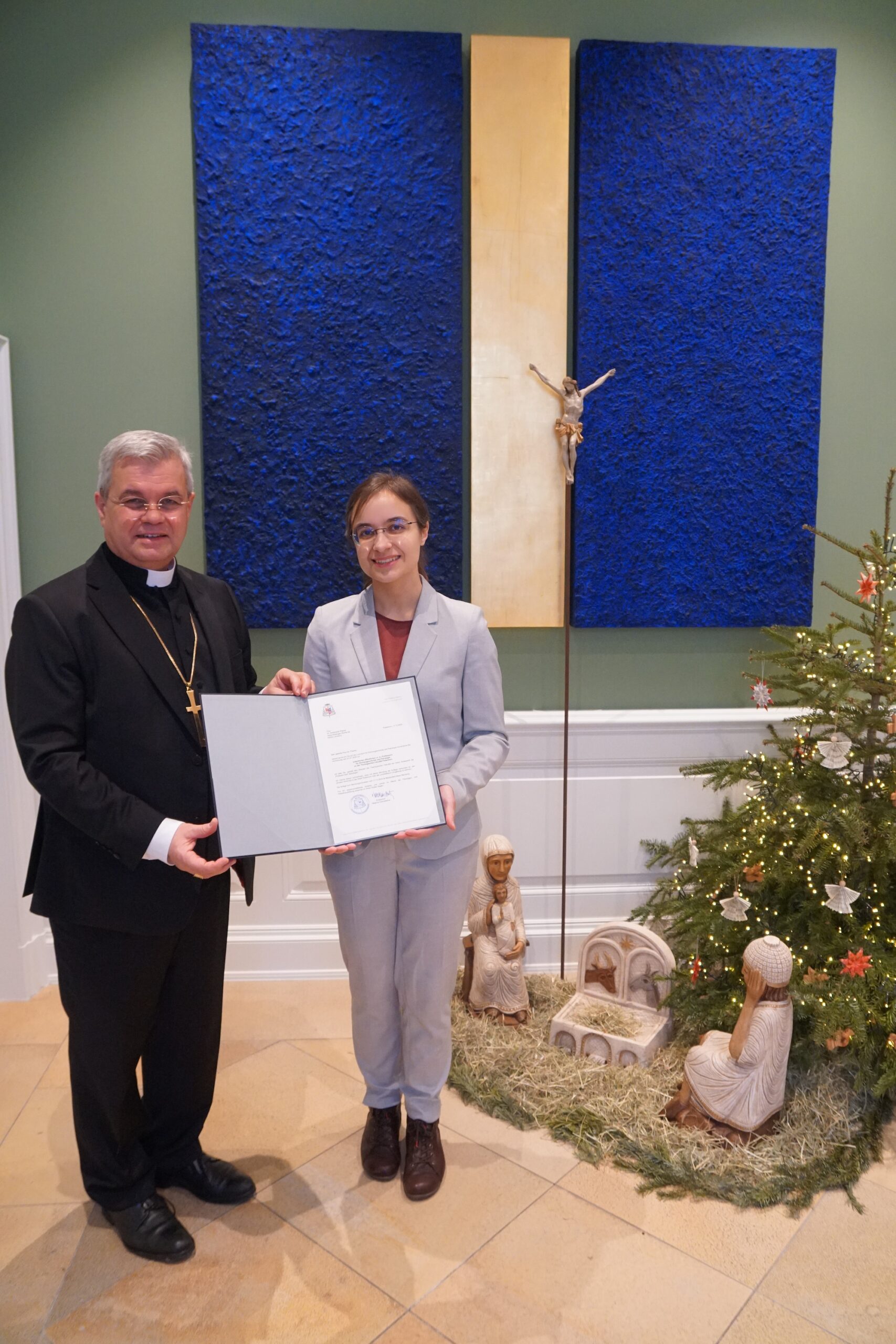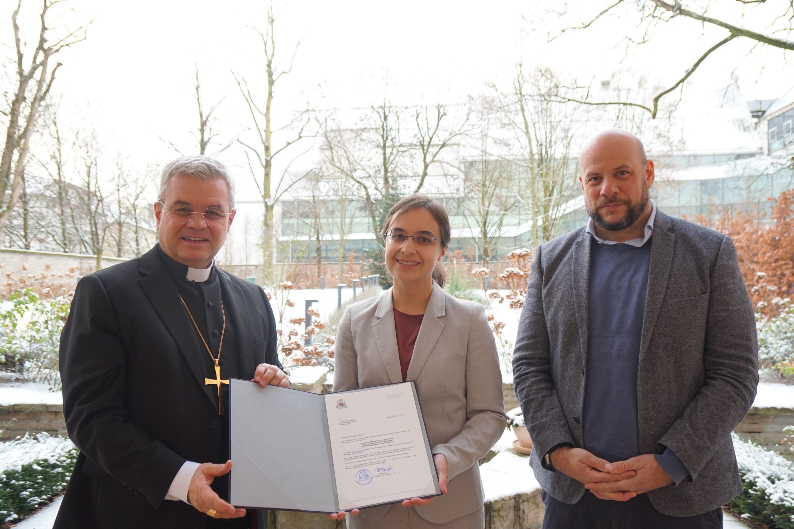 Erzbischof Dr. Udo Markus Bentz, Magnus Cancellarius der Theologischen Fakultät, überreichte der 32-jährigen Theologin nach Ablegung der Professio fidei, des Glaubensbekenntnisses, zum Amtsantritt in der Kapelle des Bischofshauses die Ernennungsurkunde. Damit tritt Professorin Pilarski die Nachfolge von Professor Dr. Dr. Dr. Hubertus R. Drobner, DD (Oxon), DLitt an, der mit dem Ende des Sommersemesters 2025 in den Ruhestand gegangen ist. Erzbischof Dr. Udo Markus Bentz wünschte der neuen Lehrstuhlinhaberin Gottes Segen für ihr Wirken und einen guten Start an der traditionsreichen Ausbildungsstätte für Theologinnen und Theologen.