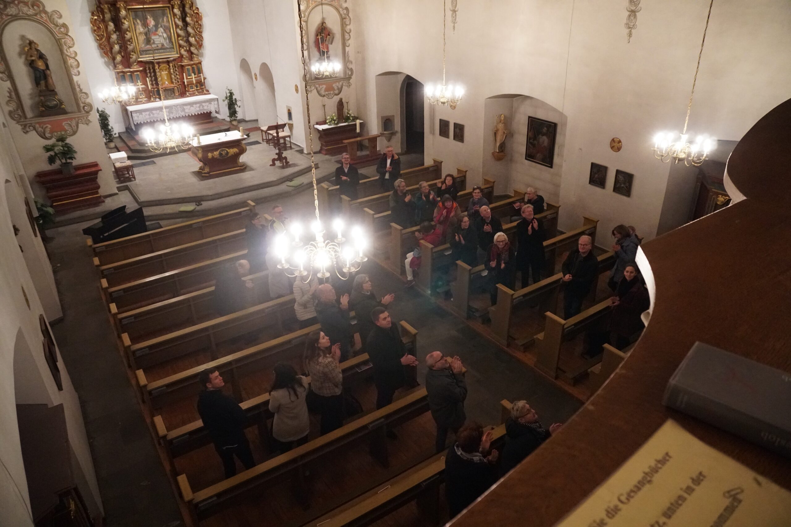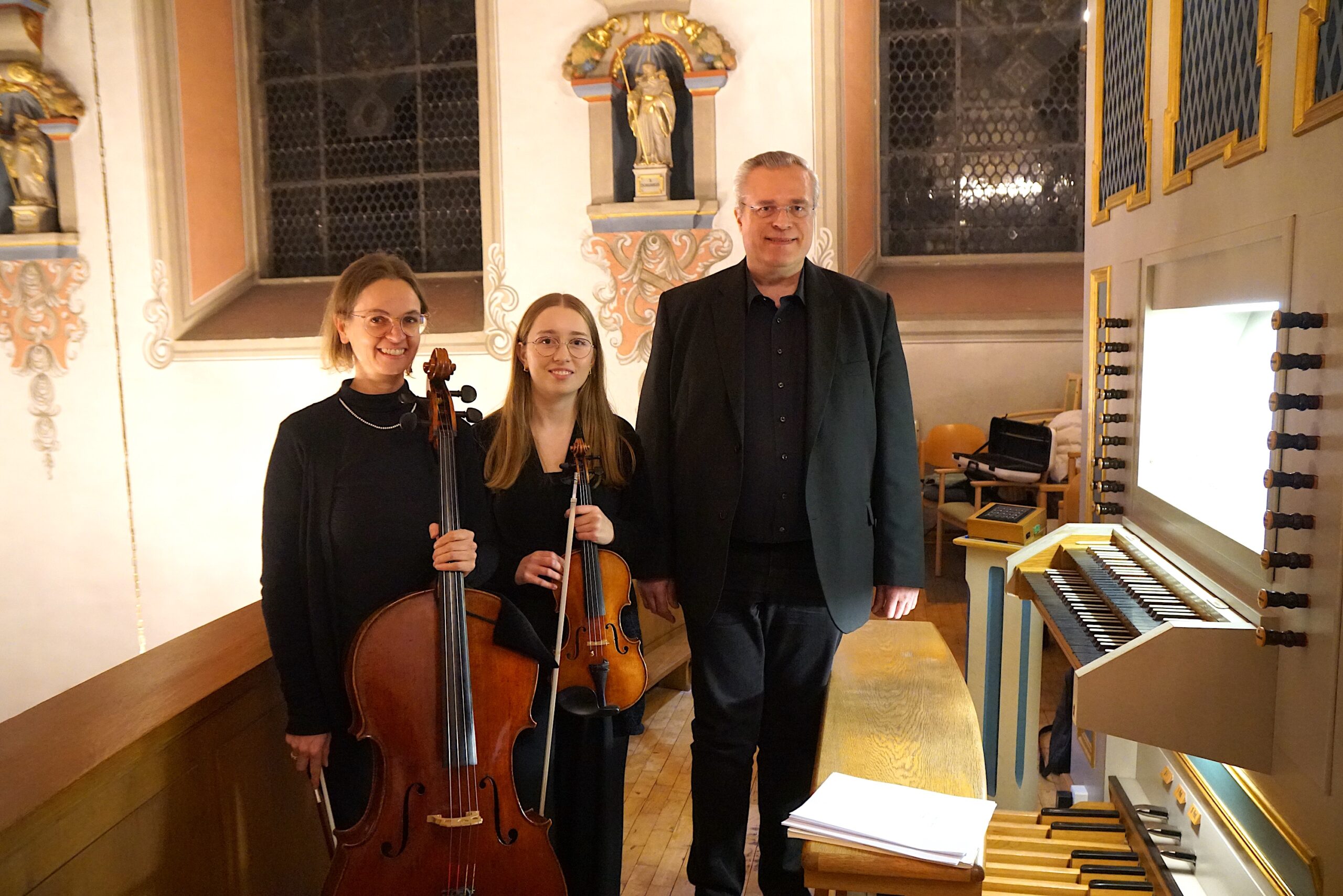 Besonders die Musik Johann Sebastian Bachs, hier insbesondere das „Air“, baute eine musikalische Brücke zwischen Himmel und Erde. Und die klug ausgewählten Werke wie Olivier Messiaens „Le banquet céleste“ – „Das himmlische Gastmahl“,  César Francks Vertonung „Panis angelicus“, Gabriel Faurés „Pavane op. 50“ und Camille Saint-Saëns „Prière op. 158 verzauberten die Teilnehmenden. Lang anhaltender Beifall dankte den drei Musiker*innen für ihr feinfühliges Spiel.