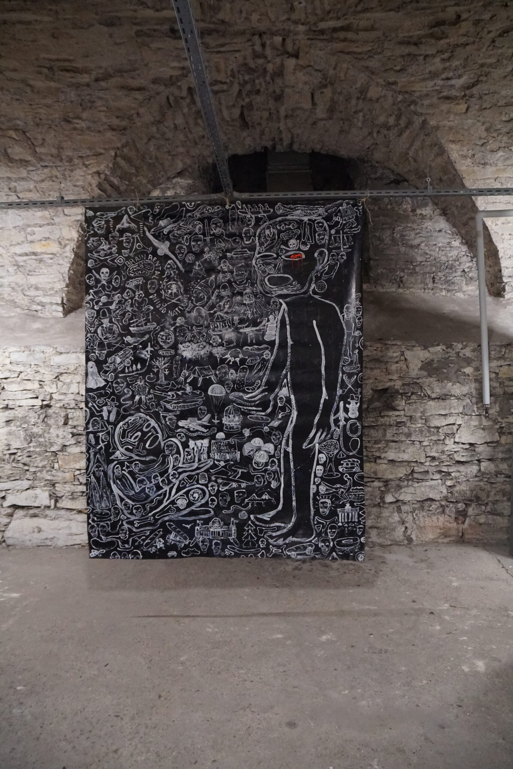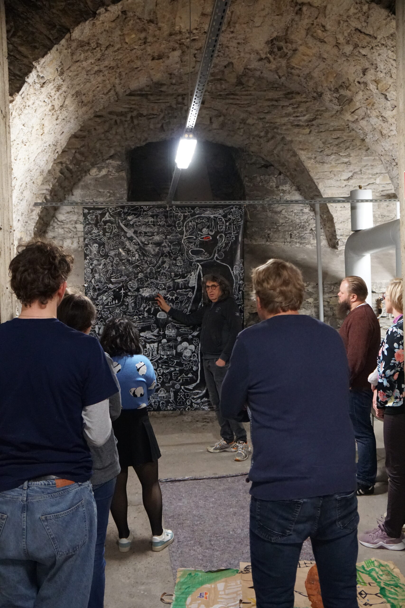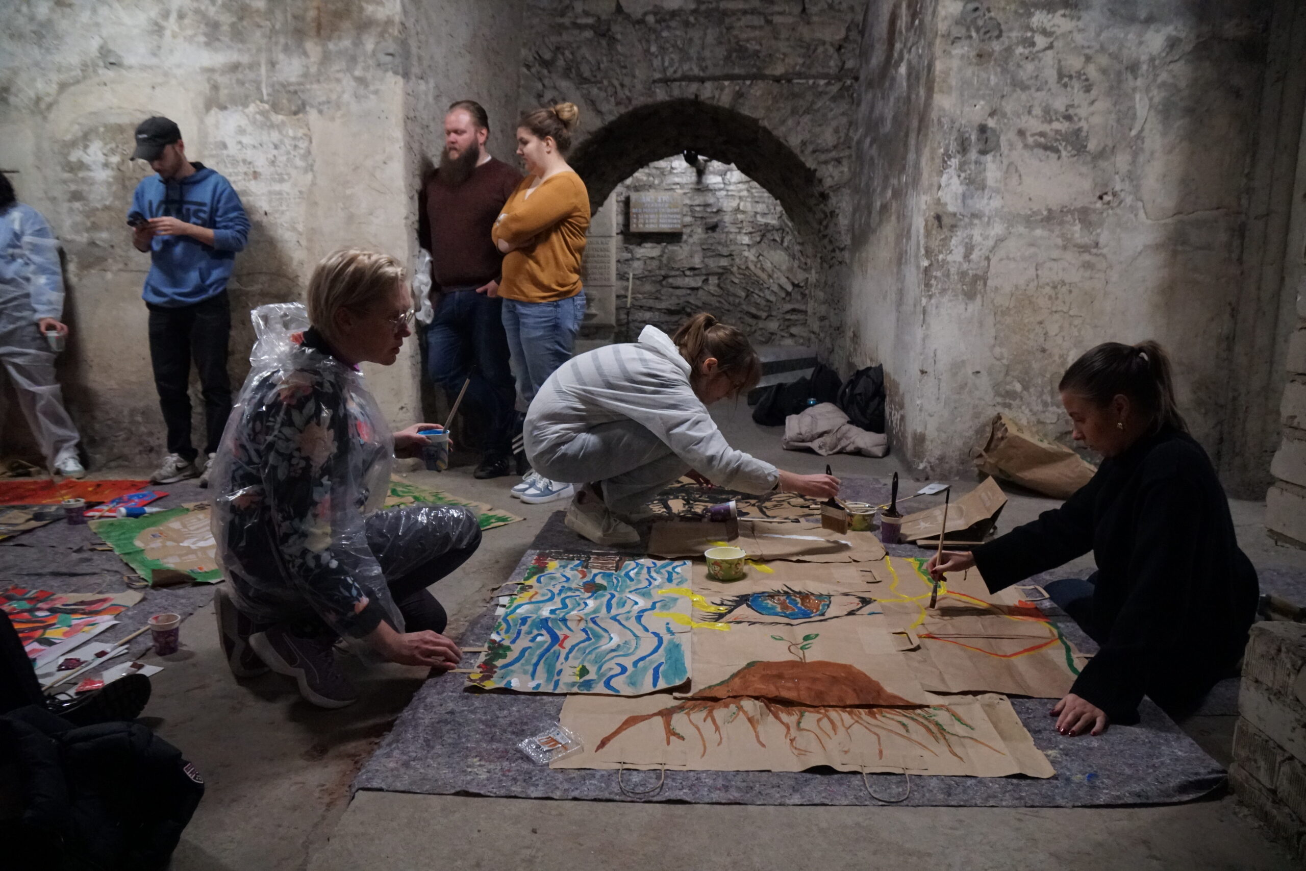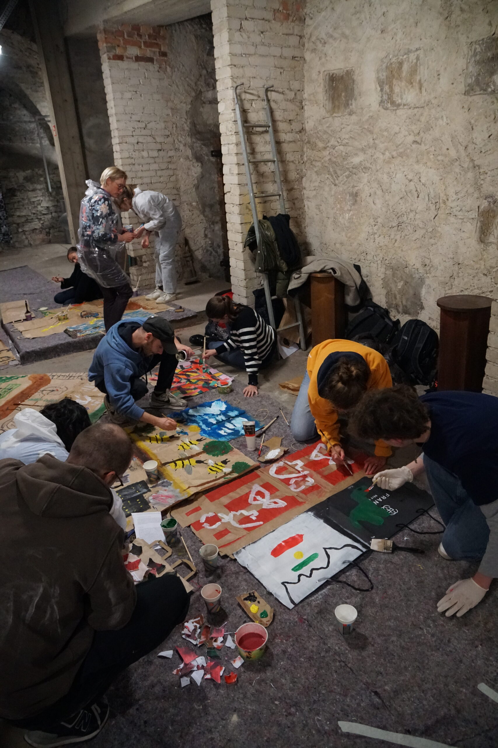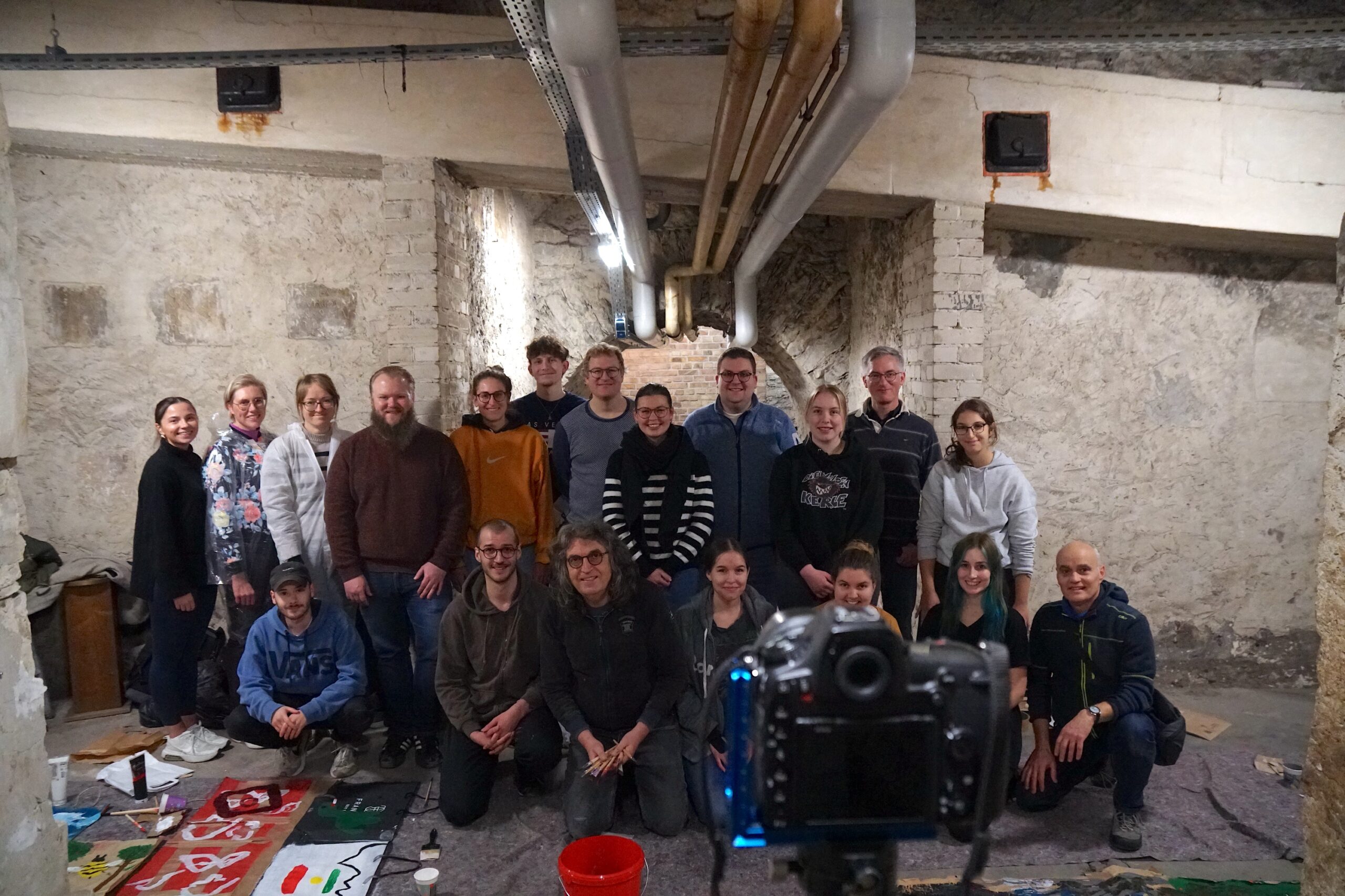 Die Studierenden setzten sich nicht nur mit der Theorie zu Kunst, Religion und Klimakrise sowie Ästhetik und Aktionismus auseinander, sondern konnten auch ganz praktische Erfahrungen machen. Das Blockseminar wurde von Prof. Dr Stephan Wahle, Lehrstuhl für Liturgiewissenschaft, und Prof. Dr. Jonas Hagedorn, Lehrstuhl für Christliche Gesellschaftslehre, durchgeführt. Die Künstler Hermann Josef Hack und Dr. Andreas Pohlmann, die mit ihrer RoadMapFuture ein partizipatives Kunstwerk in der Universitäts- und Marktkirche gestalten, begleiteten die Studierenden und die Professoren bei der Erarbeitung eigener Bildwelten, um die RoadMapFuture im Mittelgang der Kirche zu ergänzen. Im Keller der Marktkirche malten und collagierten die Teilnehmenden ihre Version einer lebenswerten Zukunft vor dem Hintergrund der (Klima-)Krisen dieser Welt. Und sie diskutierten mit den Kölner Künstlern über Ästhetik und Aktionskunst.