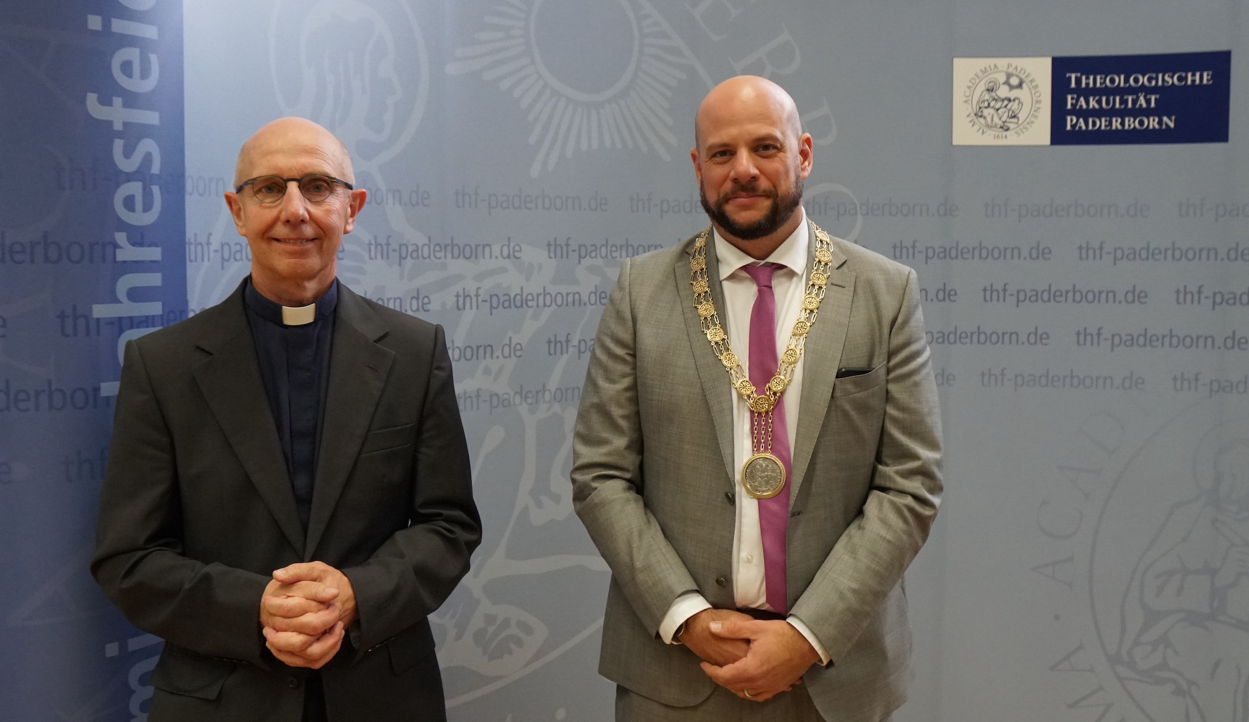 Prof. Dr. Aaron Langenfeld, der von der Fakultätskonferenz am 2. Mai 2022 als Rektor gewählt worden war, wurde im Rahmen der Akademischen Jahresfeier zu Beginn des Wintersemesters am Montag, 17. Oktober ins Amt eingeführt. Er folgt auf Prof. Dr. Stefan Kopp, der zum Wintersemester einen Ruf an die Ludwig-Maximilians-Universität München angenommen hat. „Die Theologische Fakultät Paderborn ist ein traditionsreicher Standort mit exzellenten Studienbedingungen und enormem Potenzial zur Entwicklung einer theologischen Ausbildung für Gegenwart und Zukunft“, sagte der neue Rektor im Anschluss an die Jahresfeier: Inhaltlich steht für ihn die Frage im Fokus, wie Theologie und Kirche Angebot und Herausforderung für weltanschaulich fragmentierte Gesellschaften sein können. „Dazu braucht es meines Erachtens einen vielschichtigen Dialog mit säkularer Kultur, mit anderen Religionen, aber auch einen wieder stärker ins Bewusstsein rückenden Dialog der Konfessionen“, bekräftigte Professor Langenfeld. Stärker in den Fokus gerückt werden muss für ihn zudem das Thema digitaler theologischer Bildung und Wissenschaftskommunikation. Hier sieht er, dass erste wichtige Schritte schon geleistet sind, aber auch noch einiges an Arbeit auf die Fakultät zukommt.