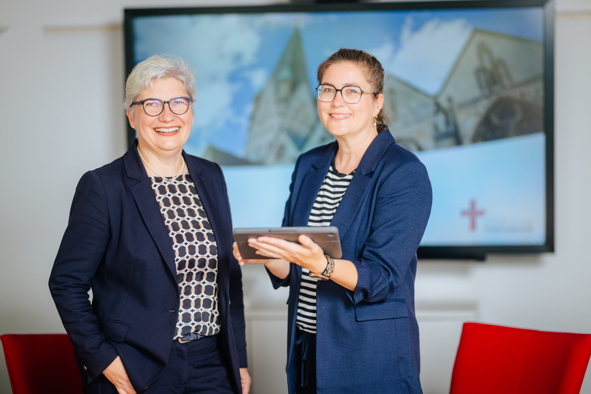 Michaela Maas, Wissenschaftliche Mitarbeiterin am Lehrstuhl für Pastoraltheologie, Homiletik, Religionspädagogik und Katechetik, war im 10. Jahrgang des Mentoringprogramms „Kirche im Mentoring – Frauen steigen auf“ als Mentorin tätig. Valerie Renken, Lehrerin am Gymnasium St. Michael, war ihr Mentee.
