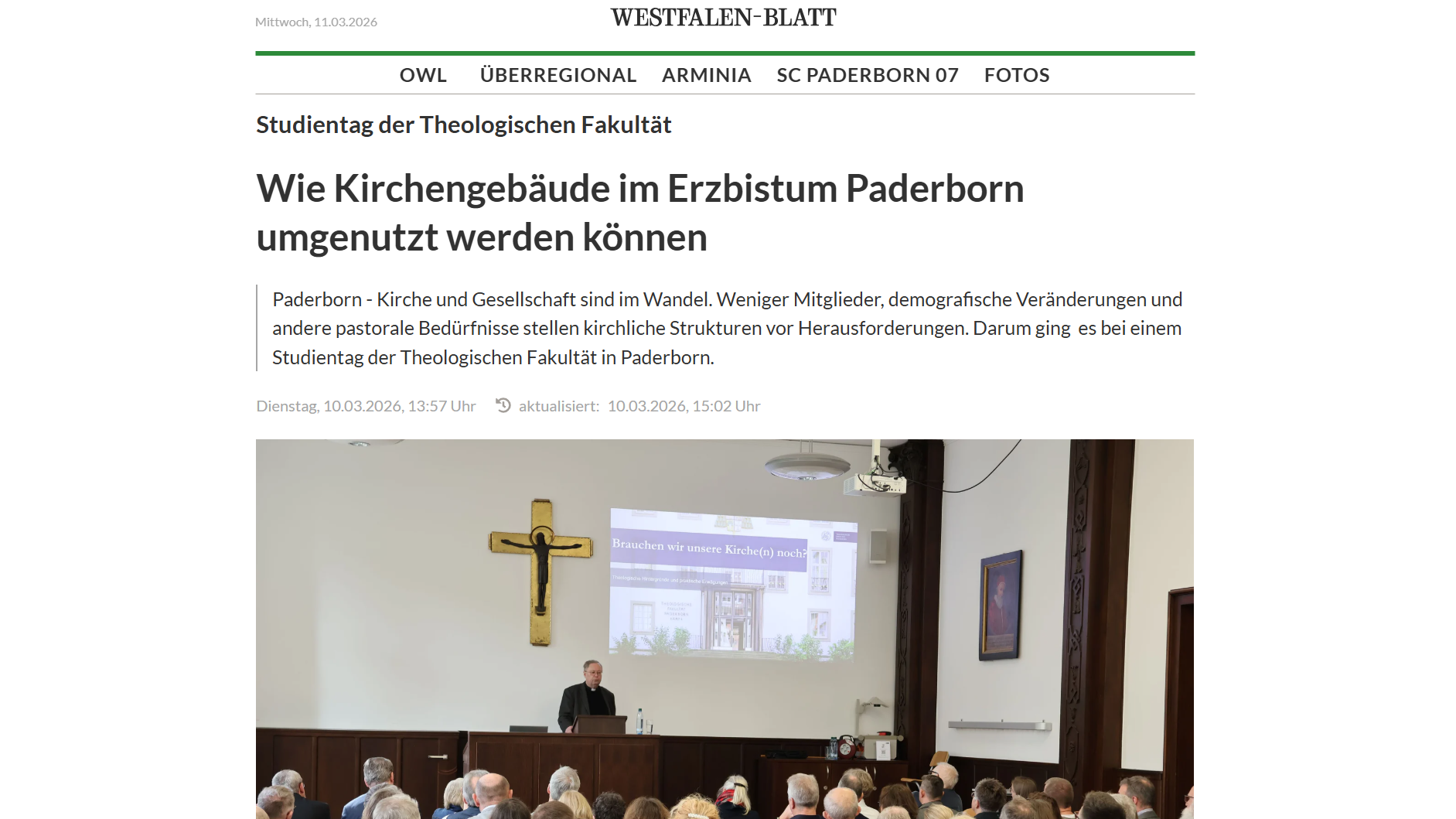 Hans-Josef Vogel (Regierungspräsident a.D.) sprach im dritten Vortrag – „Die Kirche im (digitalen) Dorf“ – über die gesellschaftlichen Aspekte. Er betonte dabei die starke Verbundenheit von Kirche und Gesellschaft, die sich vor allem in Dorfgemeinschaften und innerhalb von Stadtteilen zeigt. Die Schließung einer Kirche sei immer auch die Schließung eines öffentlichen Gebäudes. Gerade im ländlichen Raum, wo es immer seltener eigene Schulen, Banken und Einzelhandel gibt, falle eine Kirchenschließung noch einmal schwerer ins Gewicht. Kirchengebäude müssten daher immer auch als gesellschaftliche, öffentliche Gebäude verstanden werden. Er zeigte sich zudem besorgt darüber, wie der kirchliche Anspruch der Nähe zu den Menschen vor dem Hintergrund von Kirchenschließungen noch aufrechterhalten werden könne. Die Kirche dürfe sich nicht selbst zu einer Randerscheinung machen, sondern müsse ihre Präsenz aktiv aufrechterhalten. Hierzu brauche es neue Formate und Wege der Nähe. Mit Blick auf die Jugend machte er in diesem Zusammenhang besonders auf das Thema der Digitalisierung von Kommunikation und besonders auch von kirchlichen Angeboten aufmerksam.