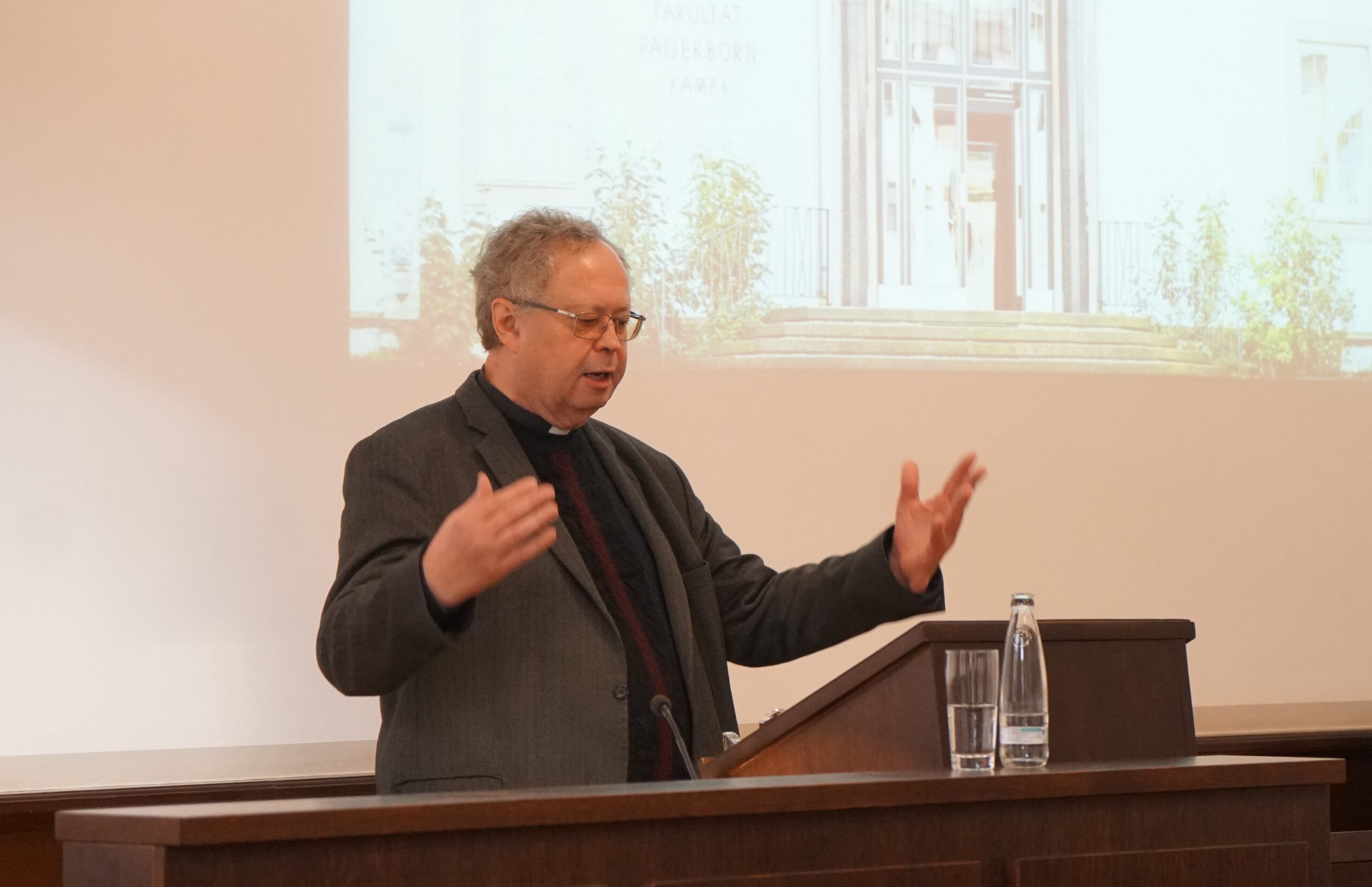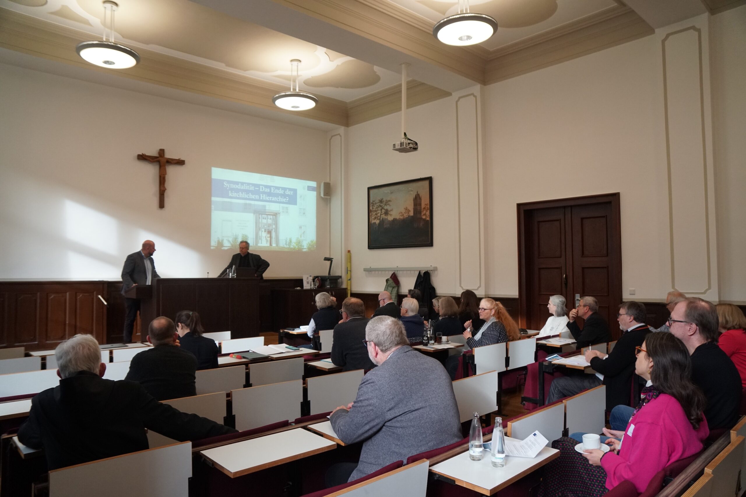 Rektor Aaron Langenfeld hob in seiner Begrüßung hervor, dass der Studientag einerseits eine Art Update zum Studientag von vor zwei Jahren darstelle, der sich mit den Abschlussperspektiven zum Synodalen Weg beschäftigt hatte. Andererseits adressiere der Studientag heute die bleibende Relevanz des Synodalitätsbegriffs für die kirchliche Selbstbeschreibung der Gegenwart. Der Auftrag, eine synodale Kirche zu sein, verbindet die Pontifikate von Franziskus und Leo. Was Synodalität aber heißt und wie sie gesamtkirchlich zu leben ist, das sei keineswegs klar und weiterhin Gegenstand heftiger innerkirchlicher Debatten. „Der Studientag will sich diesen universal und ortskirchlich drängenden Fragen widmen und im Zusammenspiel rechtlicher, praktischer, historischer und systematischer Perspektiven Klärungen herbeiführen“, schloss der Rektor.