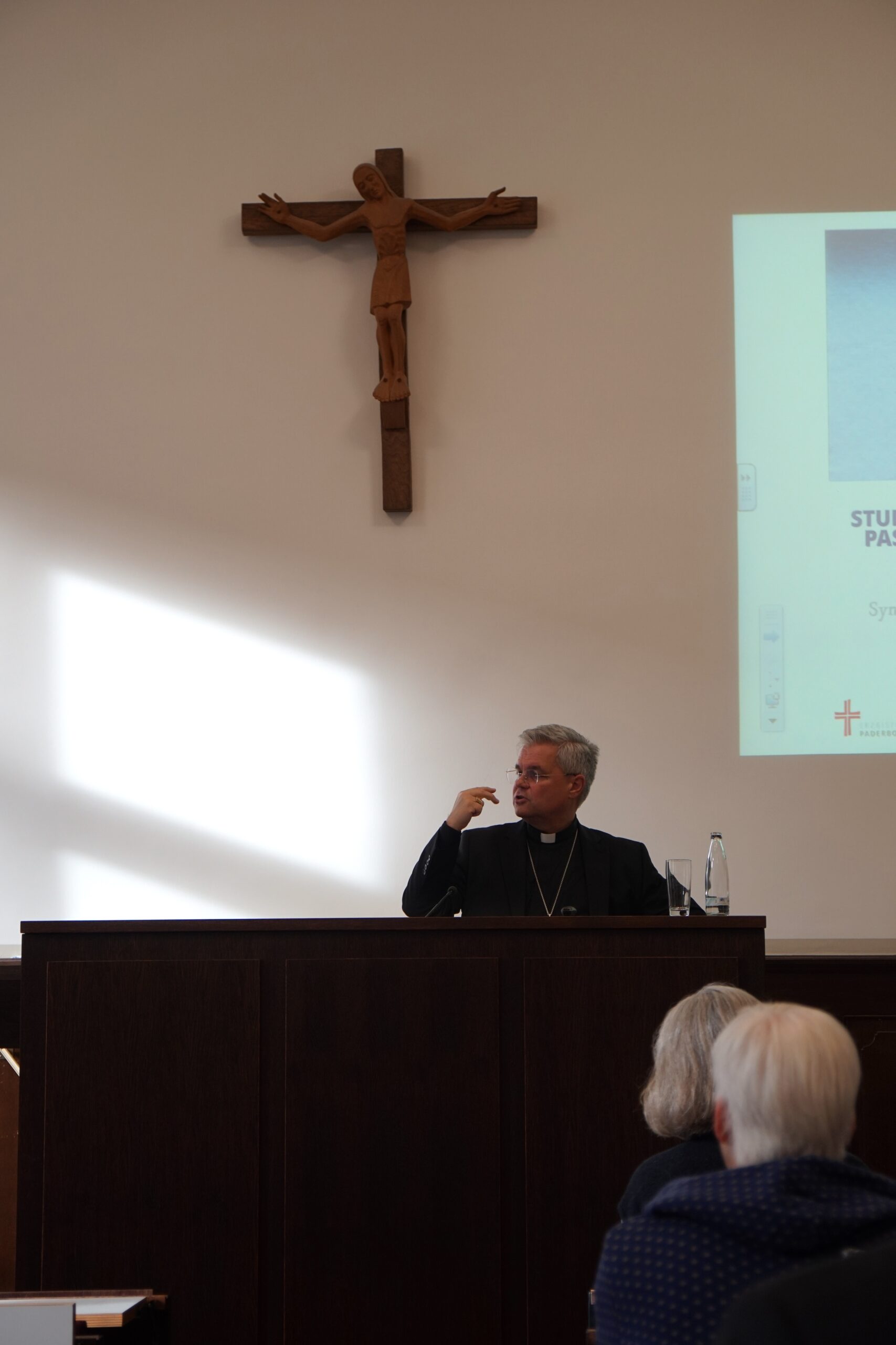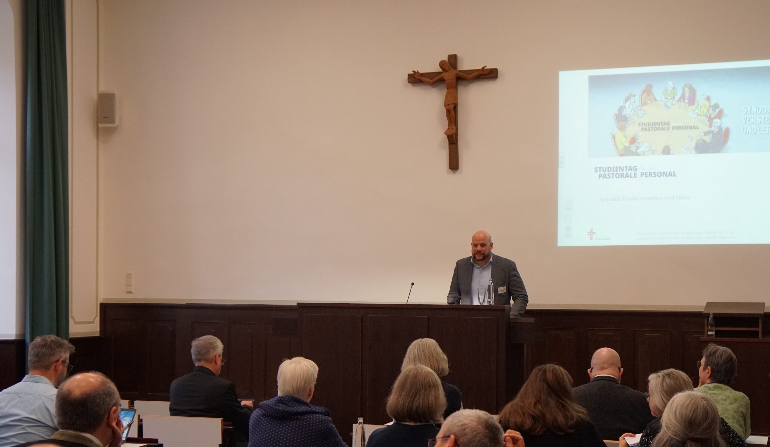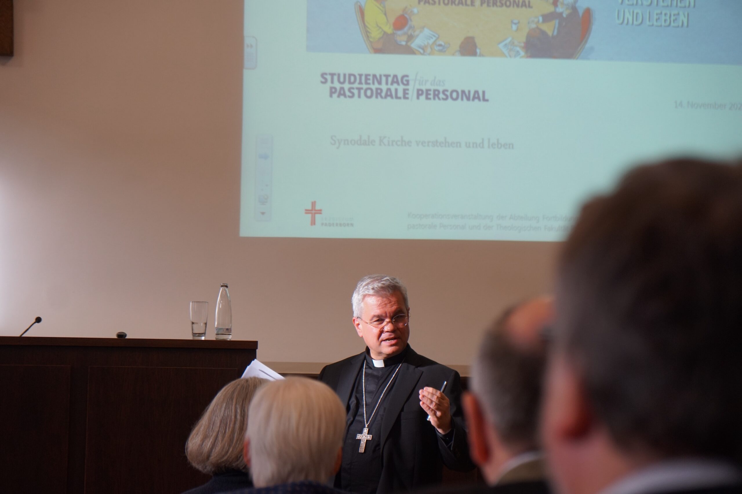 Der Vormittag stand ganz im Zeichen des Verständnisses einer synodalen Kirche. Drei Kurzvorträge beleuchteten das Thema aus unterschiedlichen Perspektiven. Erzbischof Dr. Udo Markus Bentz widmete sich in seinem Vortrag „Für eine Kirche, die verbindet und weitet. Synodale Perspektiven von der Basis bis zur Weltkirche“ der Frage, was Synodalität für die Leitung der Erzdiözese bedeutet. Prof. Dr. Rüdiger Althaus, Inhaber des Lehrstuhls für Kirchenrecht an der Theologischen Fakultät Paderborn und Mitglied des Synodalen Ausschusses, gab eine grundlegende Einführung in den Begriff der Synodalität sowie in die Entwicklungen in Deutschland und der Weltkirche über die Jahrhunderte. Prof. Dr. Florian Kunz von der Katholischen Hochschule Nordrhein-Westfalen beschäftigt sich mit der Bedeutung der Synodalität auf Gemeindeebene.