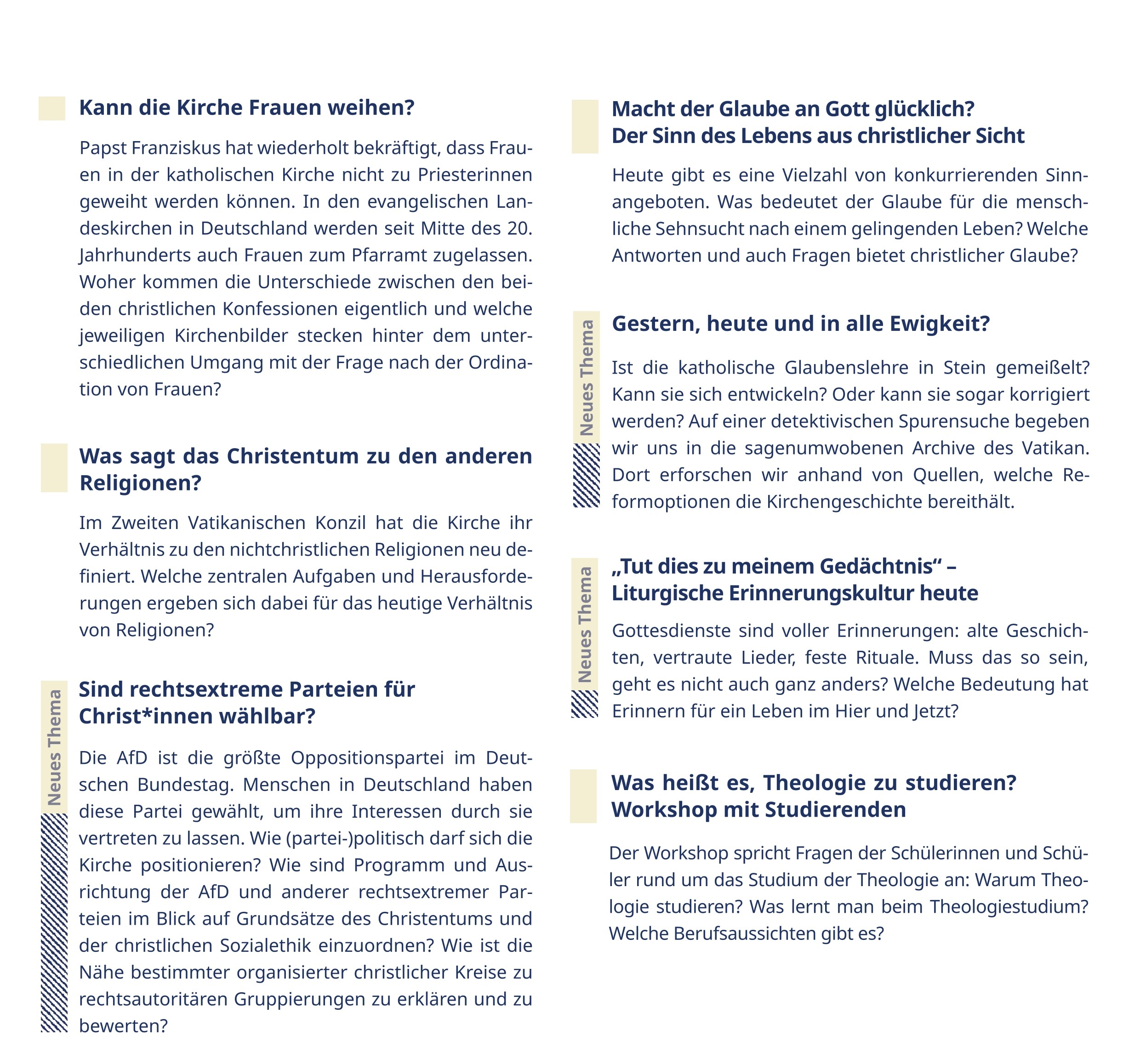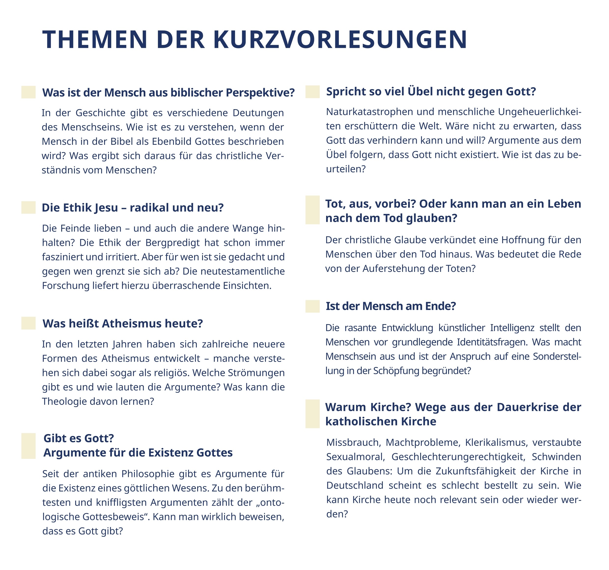 Die Vorträge vermitteln einen ersten Eindruck über aktuelle und kontroverse Themen der Theologie und Philosophie und orientieren sich dabei auch an den Inhalten der schulischen Lehrpläne. Zudem wird ein Überblick über das Studium der Katholischen Theologie und mögliche spätere Berufsfelder gegeben.