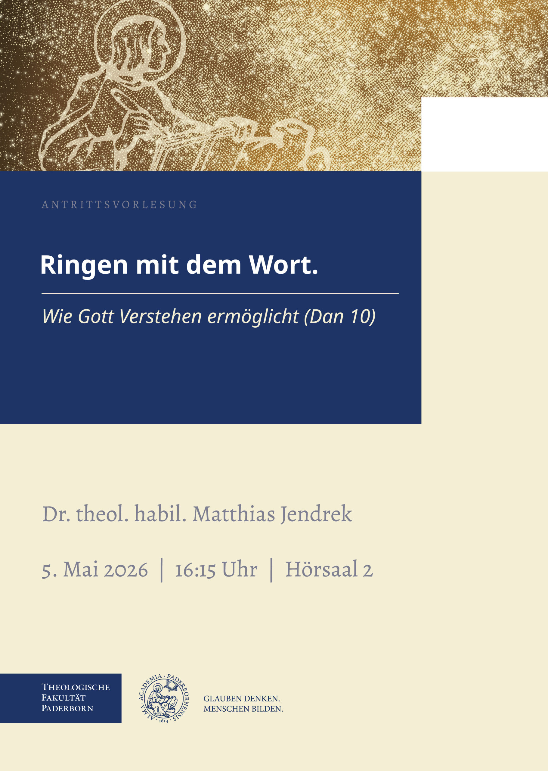 Dr. theol. habil. Matthias Jendrek hält seine Antrittsvorlesung. Im Februar 2026 hatte Erzbischof Dr. Bentz ihm die Lehrbefugnis (venia legendi) für das Fachgebiet "Exegese des Alten Testaments" erteilt. Im Anschluss an die Vorlesung findet ein Empfang statt.